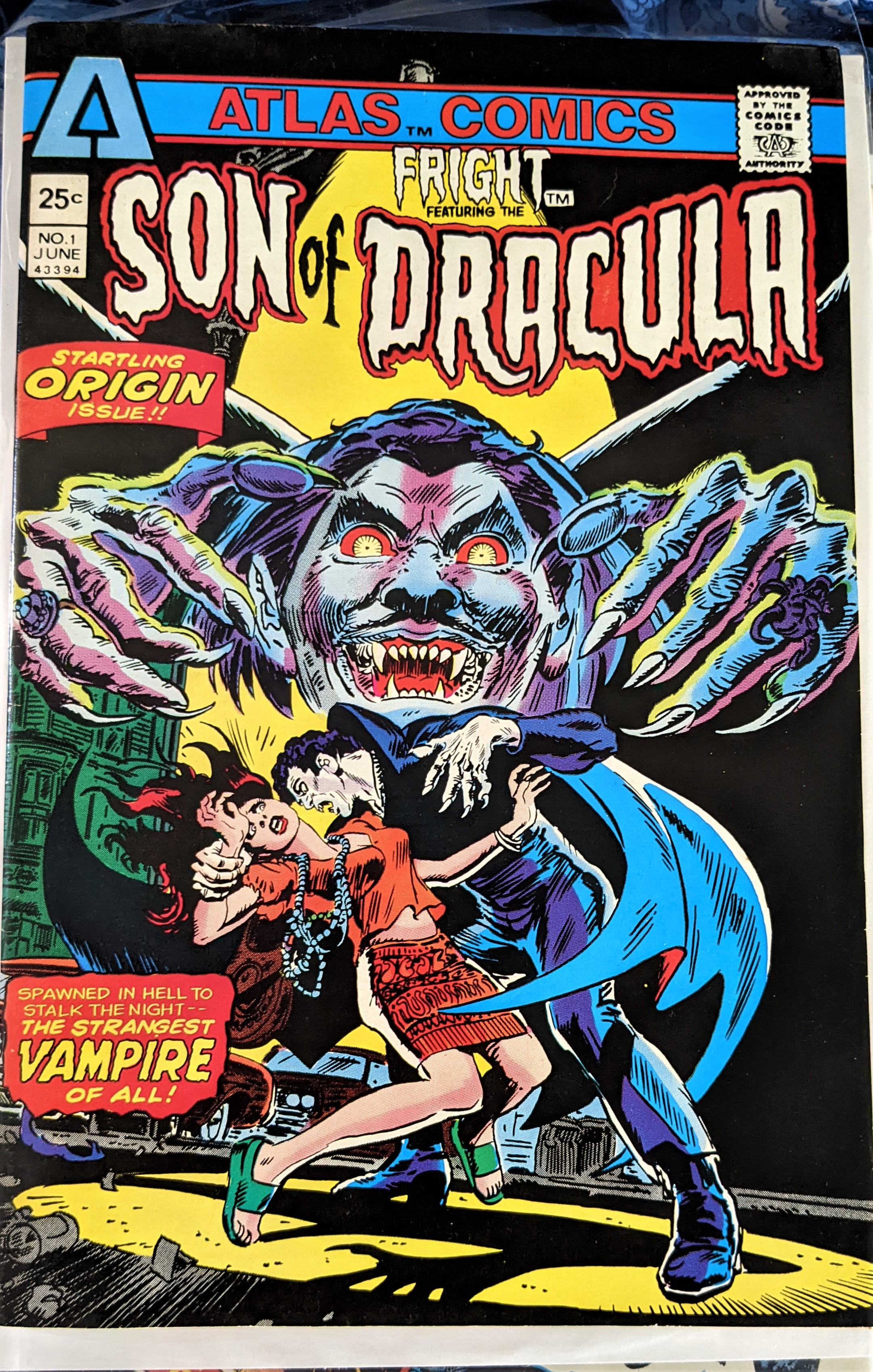 Keeping with the vampire theme, here’s another first issue from Atlas. Fright #1 (1975 Atlas) carries an origin story. In my read of it, the story is not very good. Just a mixed up mess trying to turn a vampire into some type of sympathetic character.