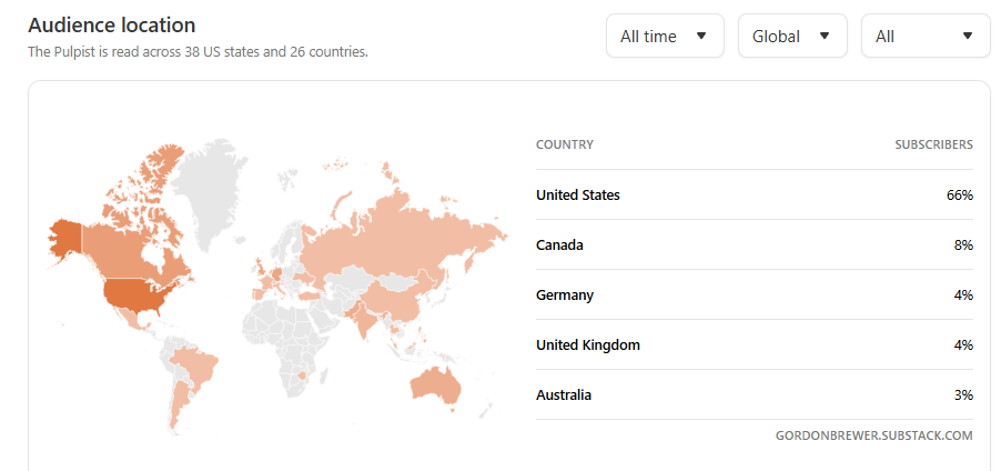 Since I’ve been looking at the stats for The Pulpist, I thought I would share some of the highlights. As you can see, the audience is worldwide but primarily based in the USA. It’s not a surprise considering that is the target market for my books. Please drop me a line sometime on the comments for this newsletter and let me know where you’re located.