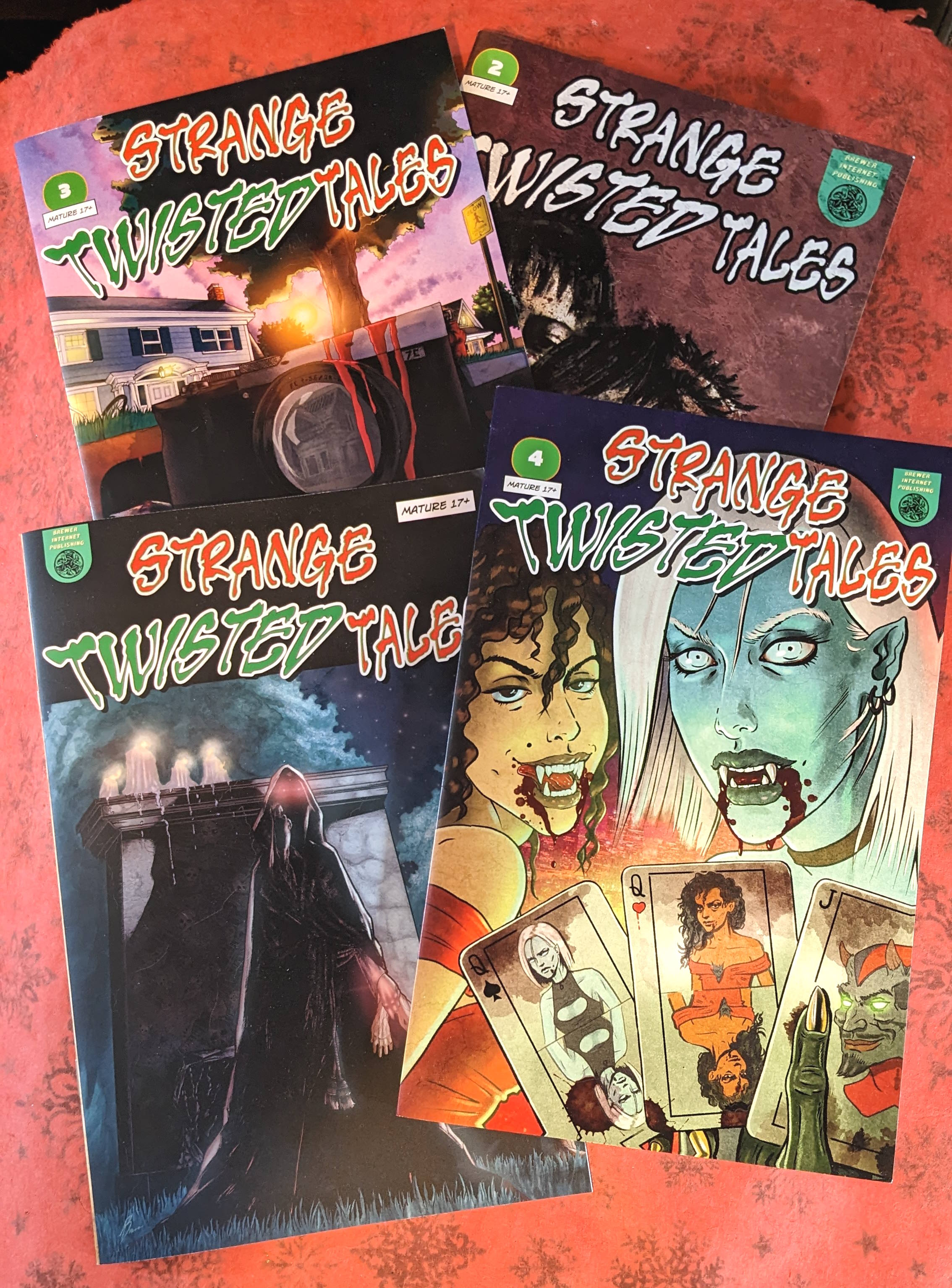 This bundle of 4 issues of Strange Twisted Tales (roughly 26 pages per issue) OR 5 issues of Creepsi (again, subscriber choice) will come via USPS and comes on top of the normal annual benefits of digital copies of all the comics created by my team, along with digital downloads of my novels, and previews of upcoming covers, panels, etc. NOTE: There is a limit of 15 founding members for this bundle.