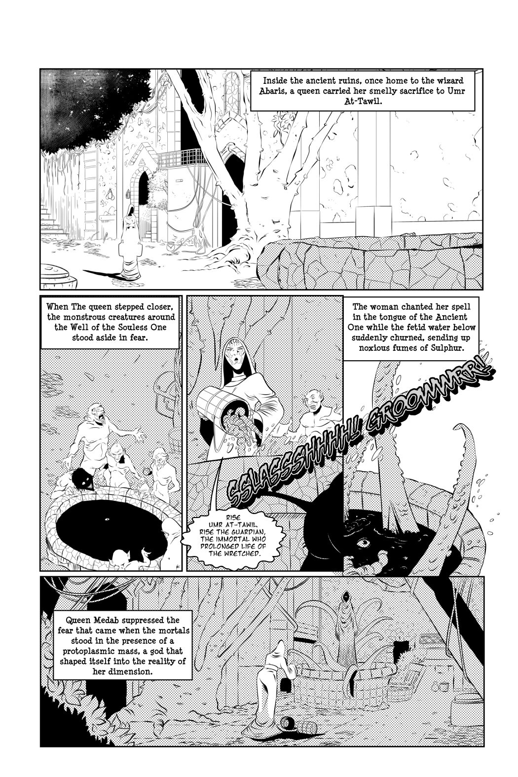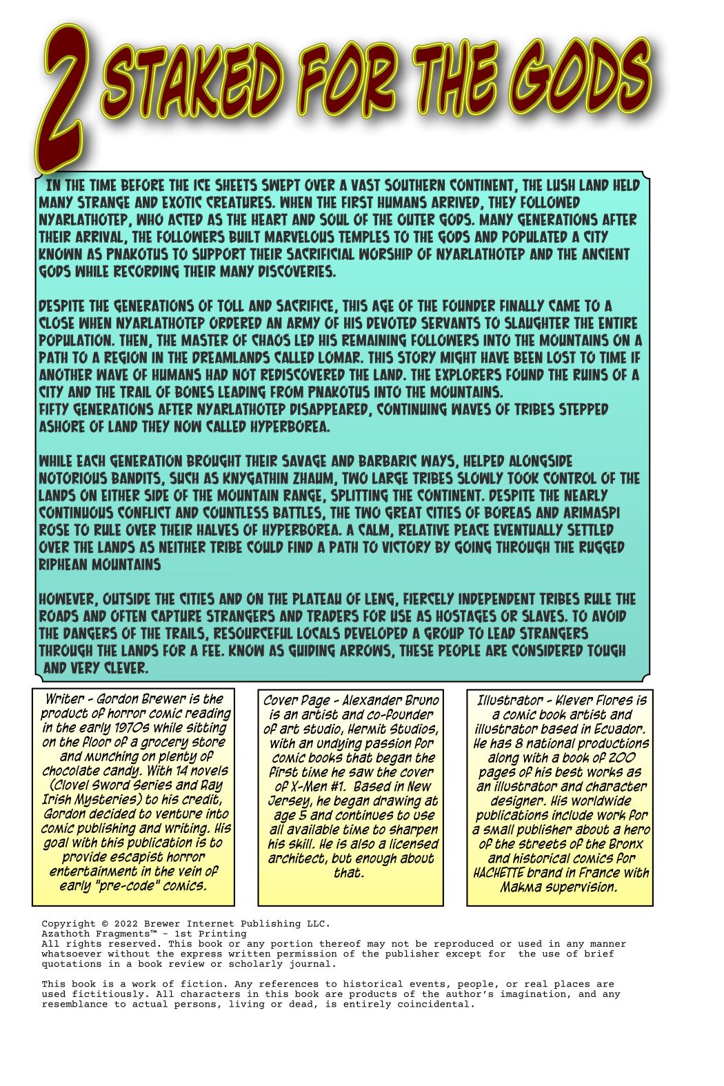 Deriving elements of Lovecraftian gods and a timeline from the Greek myth based upon the lands of Hyperborea, our story is set in Antarctica before ice sheets covered the area. It is an era of deadly monsters and beasts along with terrible gods. Belgar is a Guiding Arrow, a guide for the merchants who travel the lands trying to avoid the monsters and beasts on the trails through the rugged Riphean Mountains and the plateau of Leng. As a guide, Belgar is one of the best but he suffers from short temper and a reputation as a scoundrel. Tricked into a blood pact with Cuchulainn, a god also known as the lame one, Belgar commits to a search for a fabled sword guarded by demon hounds.