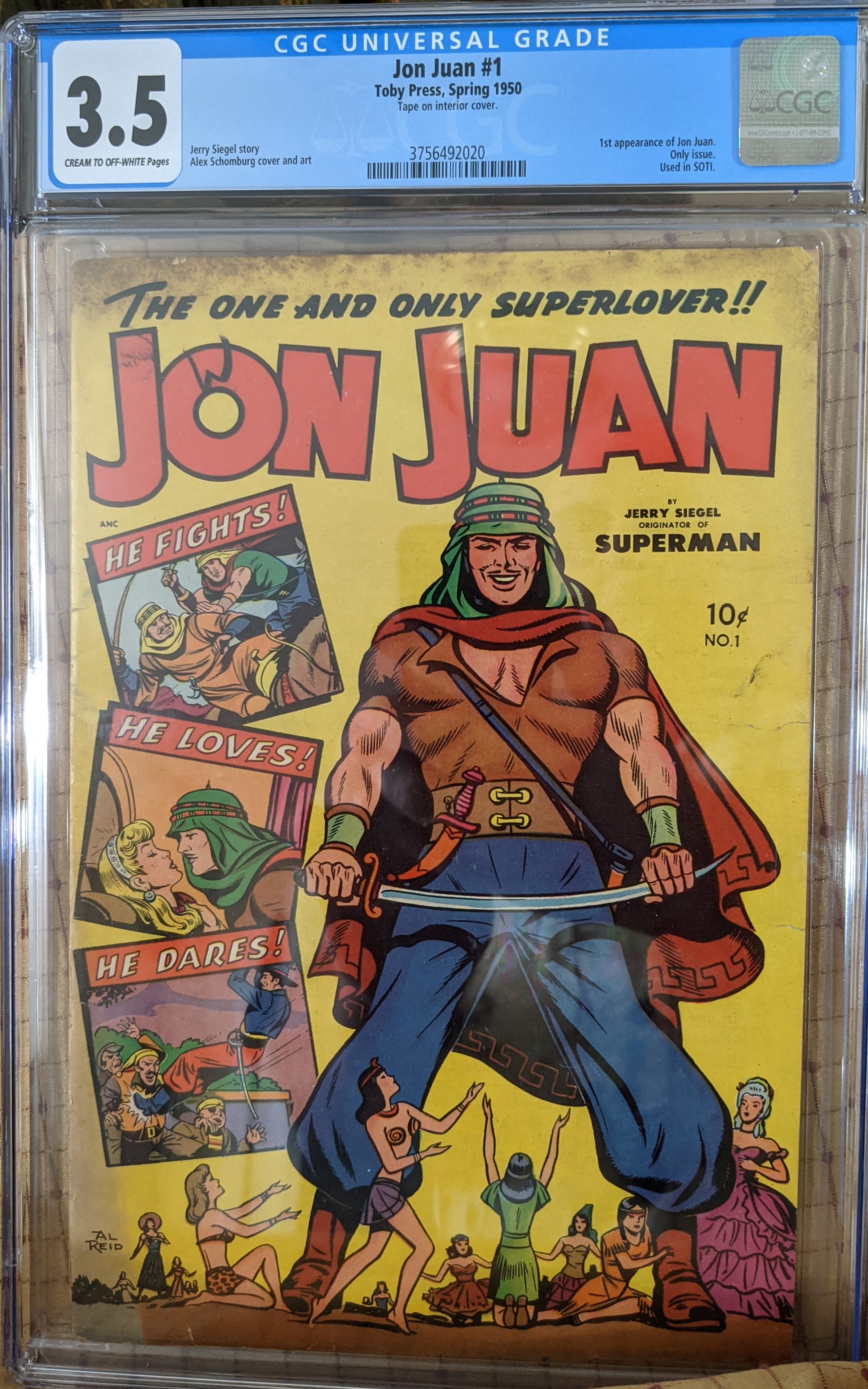 Now, here’s an interesting one shot I found. Jon Juan #1 from Toby/Minoan and published in Spring 1950. According to comicbook plus, it was written by Jerry Siegel and artwork was created by Alex Schomburg. The character is an adventurer/lover who finds all the women attracted to him and you can read it online at the comic book archives as well.