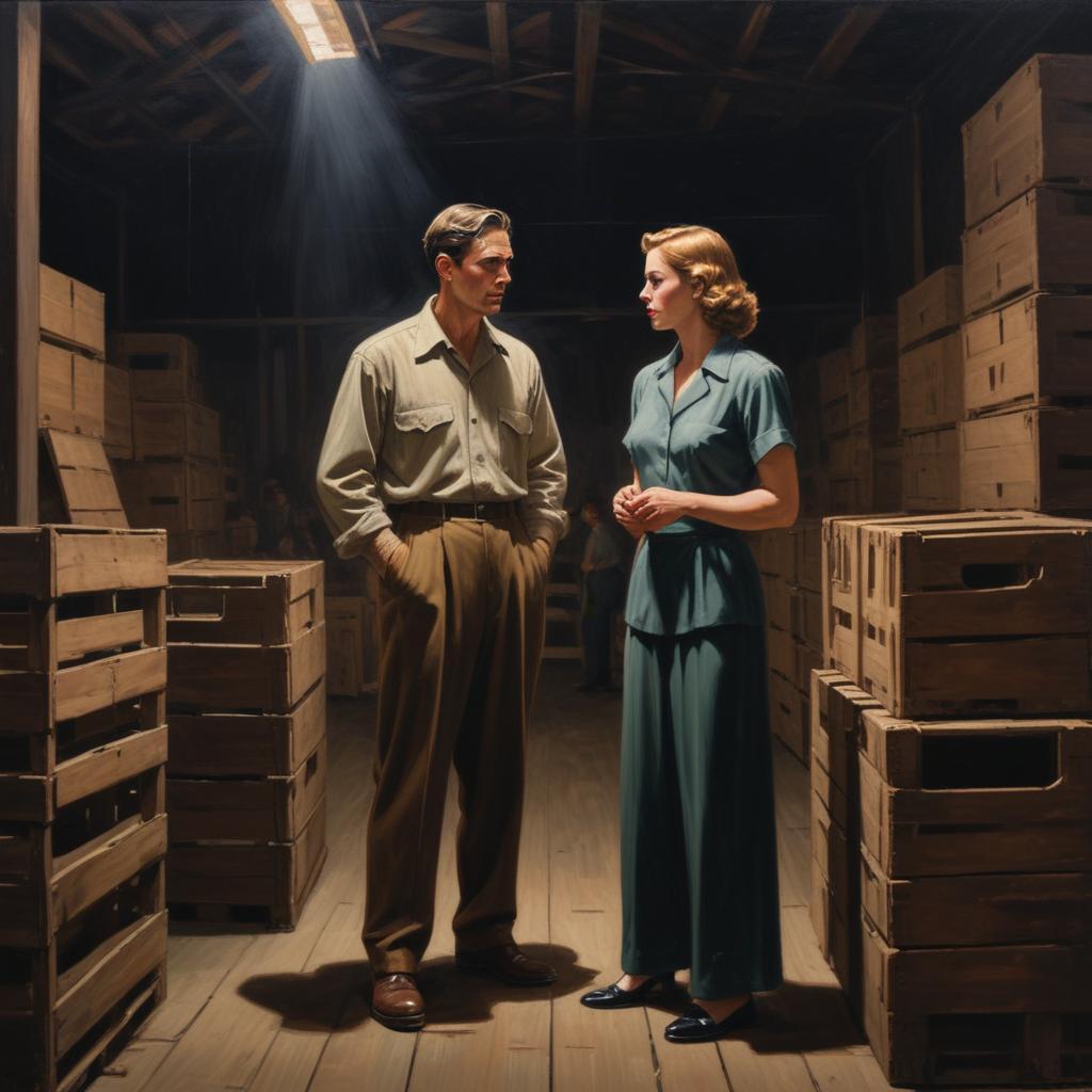 Carefully, Warren lifted the canvas tarp as he crouched near the wheel, watching the beam of light grow stronger as the person came closer to his position. Soon, the footsteps stopped next to him, and Warren froze as he watched a pair of legs walk by his position. The open-toe high heels, nylon stockings and the hem of the dress made it clear the person was not one of the crew. Warren waited until the sound finally receded before he carefully emerged from under the tarp. The outline of a tall woman snuck along in front of him, turning at the end of the row while Warren quietly followed.