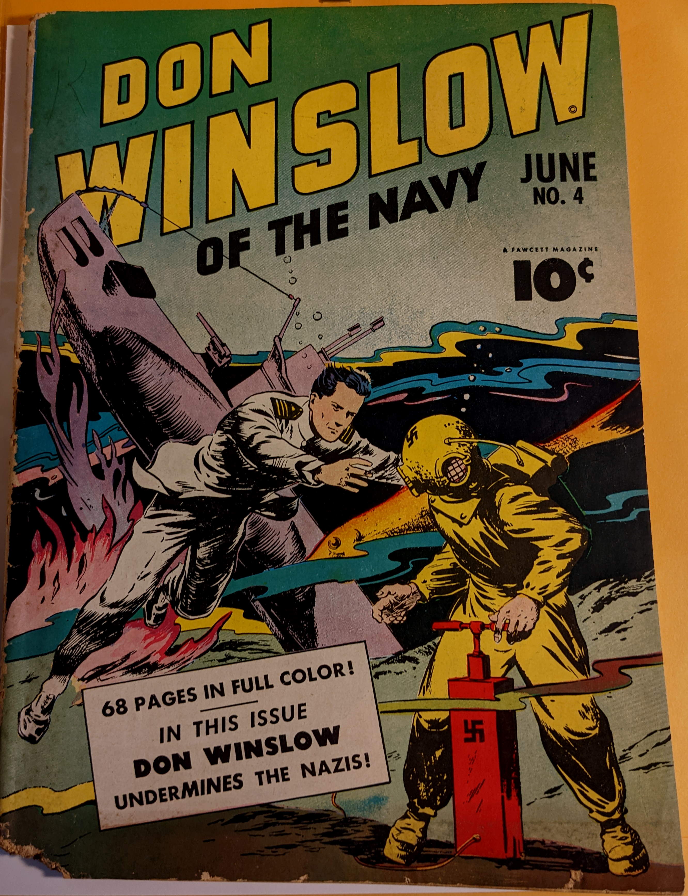 Don Winslow of the Navy came in the door as a #4 issue and shows an interesting fight under water with a Nazi saboteur on this cover.