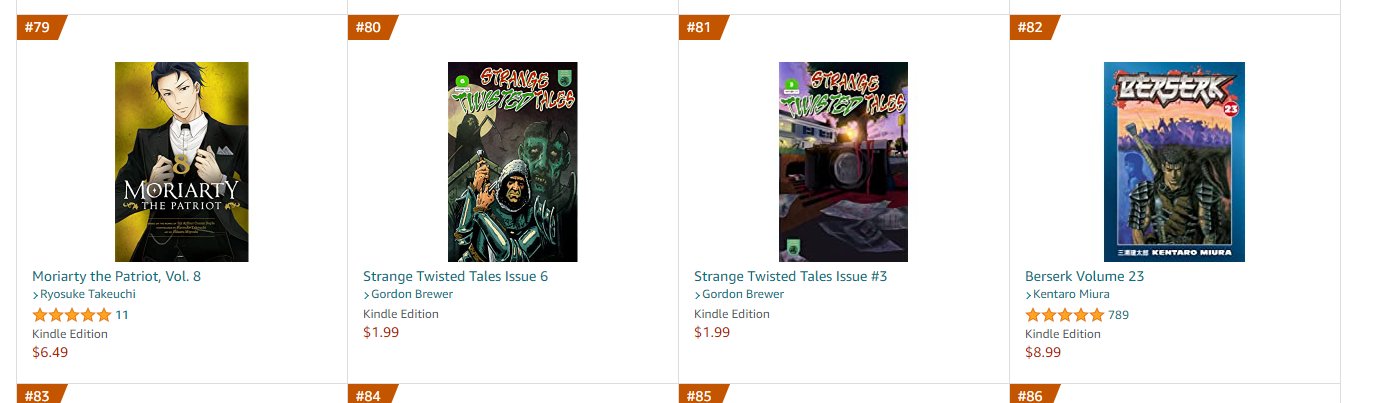 - On another note, my Strange Twisted Tales Comic reached the Top 100 paid on Amazon in the Mystery Manga category. Here’s a screen shot that I’m happy to show off. Look at my competition on either side. Don’t ask me why Manga Mystery since I’m in the comic section as well and under the horror category but I’ll take it…