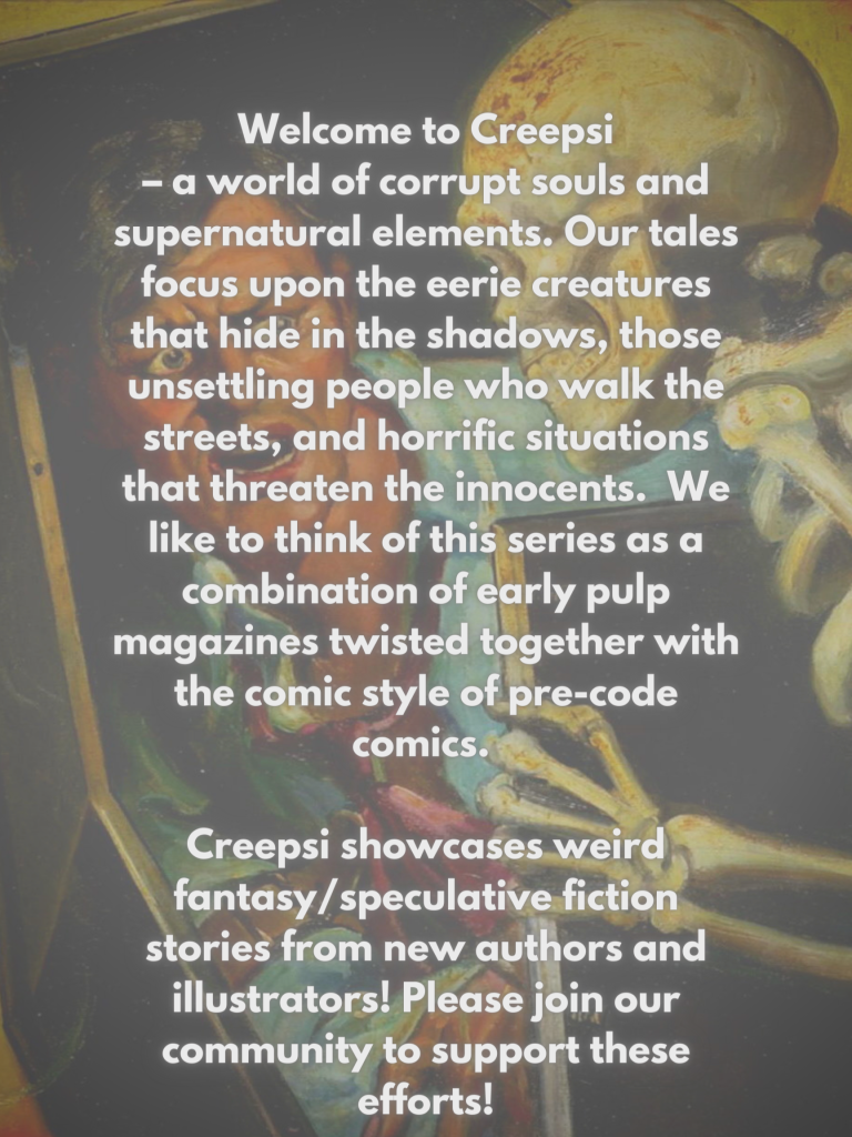 The Creepsi comic series is slowly getting traction and I can reveal more details. For those who don't know the background, here is a synopsis I put together that will go on the second page of every issue.