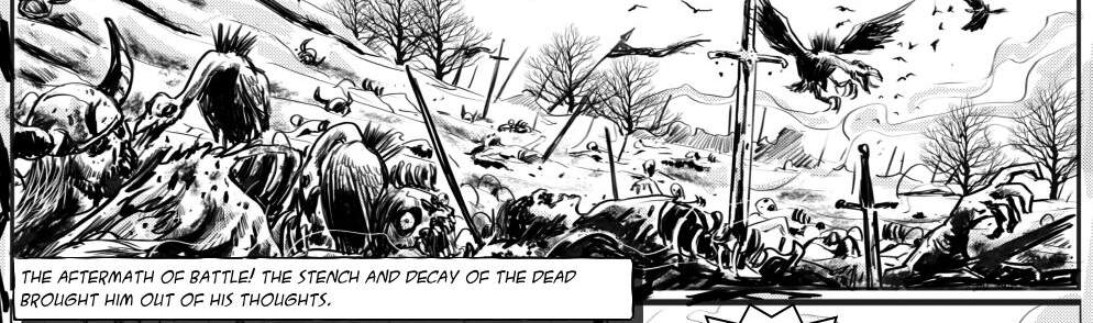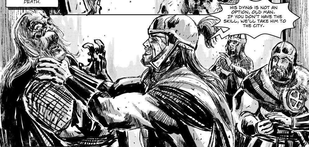Battered Soul has more pages to continue the story of Urith’s first loss to an opponent and his disfiguring injury. His part of the battle now over, he reports back to meet his father only to find that Uolven is seriously wounded. His friend, Guthlaf, joins him and they eventually discover Uolven in a healer’s house where he lays dying. Embittered by grief and his injury, Urith listens to his father’s final instructions when they are interrupted by Urith’s pregnant wife.