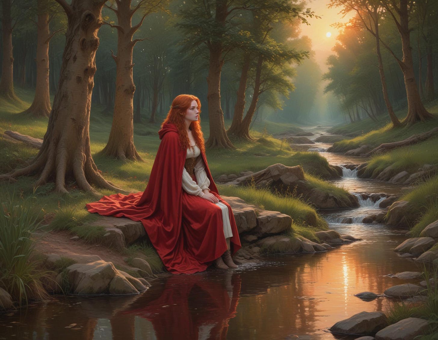 “Thou are too pretty for such a long, cumbersome name. Thou hair shines red like the setting sun. Thou lookth like a gem. So, I giveth thee a name for only me to useth. It’ll be best for a new identity since you’re running away from that man.”