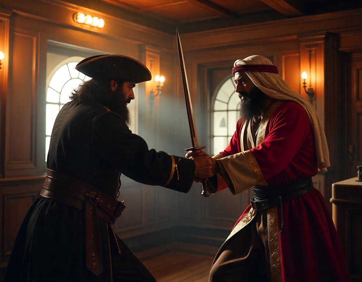 Hamidu roared out curses in Turkish as he charged. The two large men met in the center of the cabin. Their swords struck together with a loud clang while the woman tried to escape from the room. Neither man noticed as they backed away a half-step. Each was looking for an advantage. Blackbane attacked, swinging his sword as he sidestepped closer to the bed. He already noticed his rapier hanging on the bulkhead. Hamidu displayed it there like a trophy.