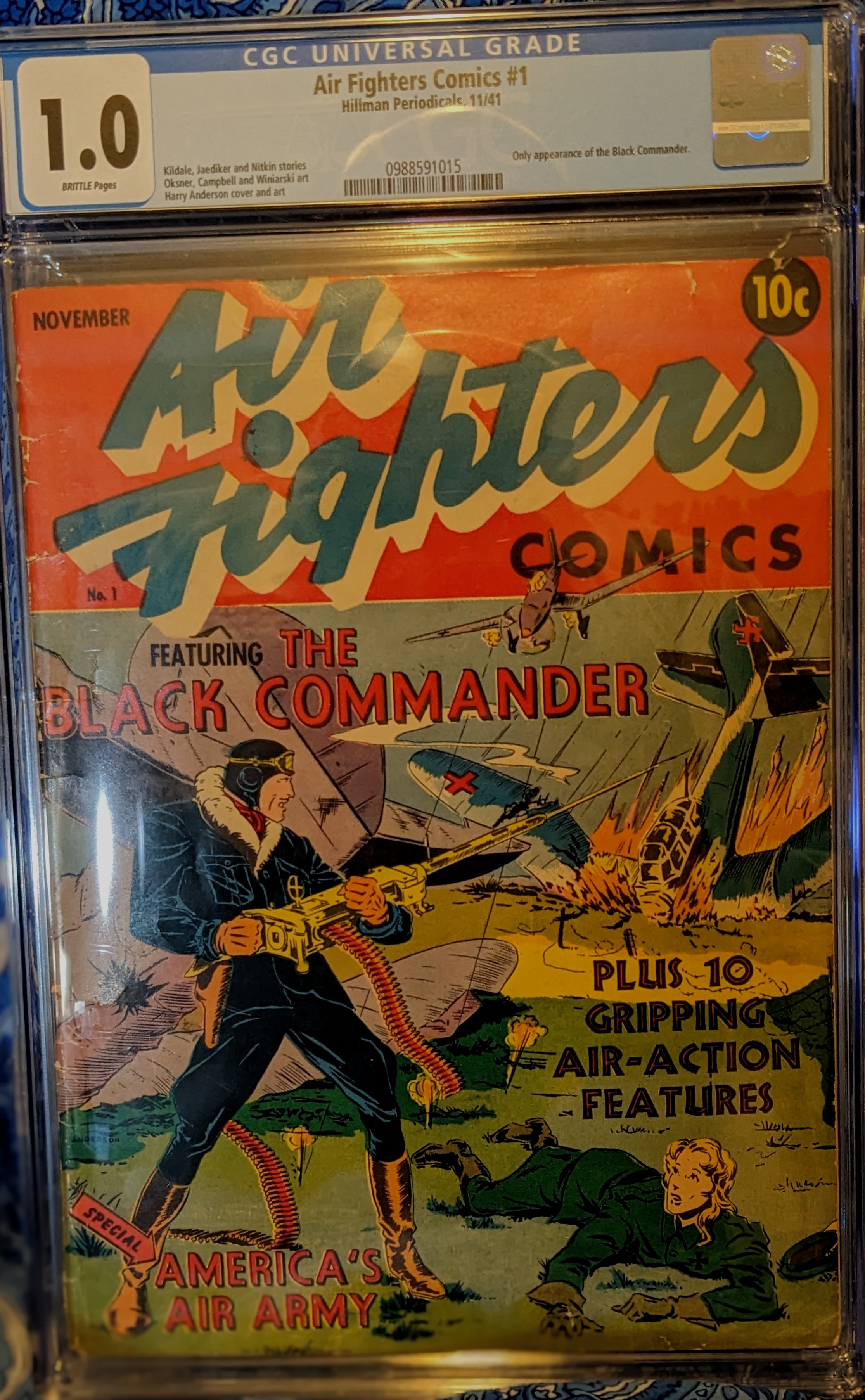 From 10 years earlier, in November 1941, you have the first and only appearance of Black Commander in Air Fighter Comics by Hillman Periodicals. The 22 issue run is more famous for Airboy, the Golden Age aviator hero and his sentient plane, “Birdie”.